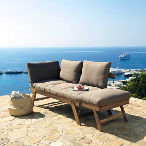 Loungestoel Van Massief Acacia Met Taupekleurige Kussens Noumea Maisons Du Monde . Style Maison De Ce Tapis Avec Ses Motifs Géométriques Bleus Sur Fond Blanc Est Particulièrement Séduisant Sur Une Terrasse En Bordure De Piscine Ou Dans Le Jardin Pour Assoir.